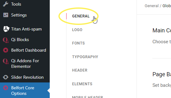 Now let’s set up the general look and feel of your site. If you have imported a demo site and would like to keep its general look and feel, then you do not need to do anything else. Otherwise, you can go to Belfort Core Options > Typography and in the General Typography section set a default font family and styles for your site. Next, you can navigate to Belfort Core Options > General, and in the Main Color field set a default main color for your site.