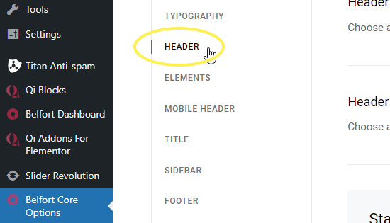 To set up your header, navigate to Belfort Core Options > Header from your WordPress admin panel. The settings you define here will be the default settings for all pages on your site. If you need any help in further understanding any of these options, please refer to the Belfort Core Options section of this User Guide.