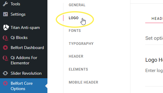 To add your logo to the header, navigate to Belfort Core Options > Logo from your WordPress admin panel and click the upload button next to the Logo – Main field. After you upload your image and save the options, you should have a visible logo in your header area. For more information regarding the various logo types that can be uploaded, please refer to the Belfort Core Options section of this User Guide.
