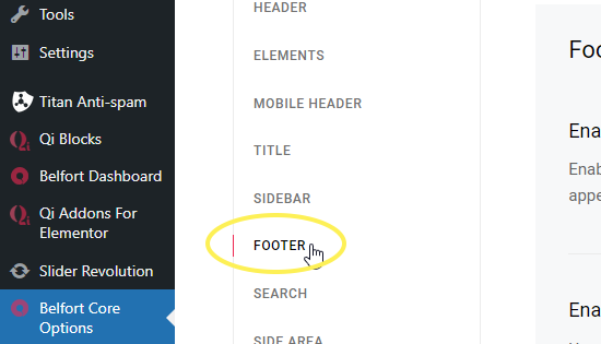 To set up your footer, navigate to Belfort Core Options > Footer from your WordPress admin panel.